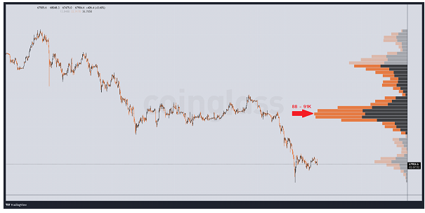 همچنین از منظر حجم معاملات تجمیعی طی روند نزولی اخیر در قیمتهای مختلف مشاهده می کنیم که در محدوده قیمتی ۸۸ الی ۹۱ هزار شاهد بیشترین حجم معاملات فیوچرز هستیم که عموما چنین نواحی قیمتی پتانسیل این را دارد که مانند آهنربای قیمت عمل کرده و قیمت را به سمت خود بکشند. این ناحیه نیز با مقاومت دوم ما در حوالی ۹۰۵۰۰ الی ۹۱۰۰۰ دلار همپوشانی دارد.