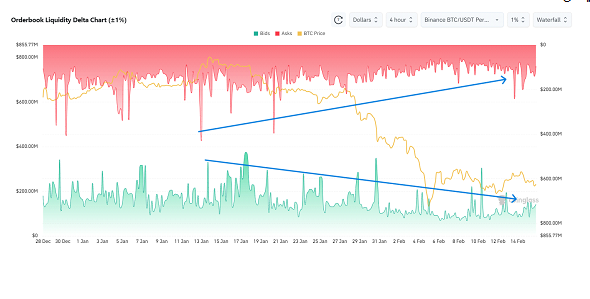با بررسی دادههای بازار فیوچرز باز هم به همین نتیجه میرسیم که بازار کریپتو در وضعیت رکودی و خطرناکی قرار دارد. پیشتر از کاهش حجم معاملات بازار فیوچرز و کاهش OI گفتیم، در ادامه نیز سایر شواهد مبنی بر کاهش نقدینگی در بازار مشتقات را هم بررسی میکنیم. نمودار زیر عمق بازار ۱٪ بیتکوین در صرافی بایننس است.