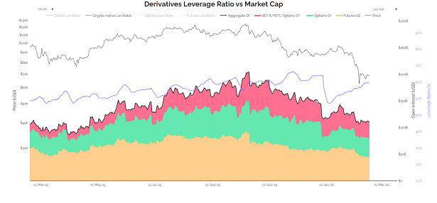 نمودار پایین نشاندهنده میزان فعالیت بازار مشتقات در کنار میزان استفاده از اهرم در بازارهای مشتق شده از کریپتو است.