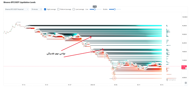 نمودار بالا میزان نقدینگی حاصل از لیکویید شدن معامله گرانی است که از لوریجهای بالا استفاده کردهاند. مشاهده میکنید که در سمت خریداران اعداد حوالی ۶۵ هزار دلار و در سمت فروشندگان قیمتهای حوالی ۸۰ و ۸۹ هزار دلار بیشترین میزان لیکویید شدن را دارند. این نواحی نقدینگی جذابیت زیادی برای بازارساز دارند چرا که سرمایهگذاران خرد و پرریسک طعمههای خوبی برای شکار و استاپهات شدن هستند. پس در کنار همه موارد گفته شده انتظار نوسانات شدید دو طرفه به سمت نواحی یاد شده محتمل بنظر میرسد.
