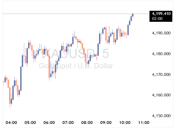 روند رکوردشکنی طلا در بازارهای جهانی متوقف نشده است. این فلز گرانبها امروز با ۱.۳٪ افزایش دیگر، به رکورد تاریخی جدید 4,199 دلار در هر اونس رسید و هدف بعدی