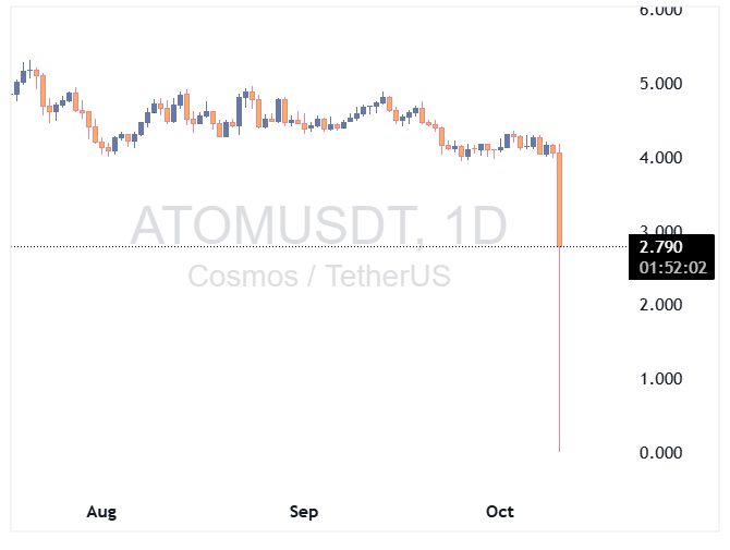 در جریان سقوط شدید بازار رمزارزها، قیمت ATOM در صرافی بایننس بهطور لحظهای تا ۰.۰۰۱ دلار افت کرد. این نوسان شدید که بهصورت «wick (سایه، شدو)» ثبت شده، نشاندهنده اختلالات