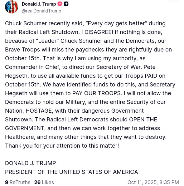 ترامپ: چاک شومر اخیراً گفته «هر روز اوضاع بهتر میشود»—در حالیکه دولت را با سیاستهای چپ رادیکال تعطیل کردهاند. من مخالفم! اگر اقدامی صورت نگیرد، بهخاطر «رهبری» چاک شومر و