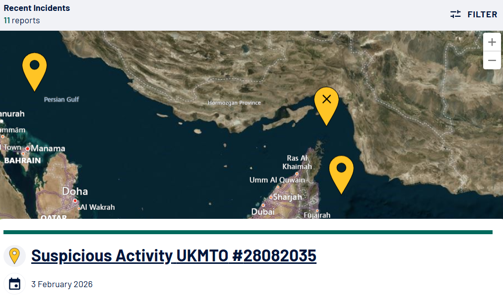 مرکز عملیات تجاری دریایی بریتانیا (UKMTO) اعلام کرده که یک حادثه امنیتی در ۱۶ مایل دریایی شمال عمان و در مسیر ورودی تنگه هرمز گزارش شده است. طبق این گزارش،
