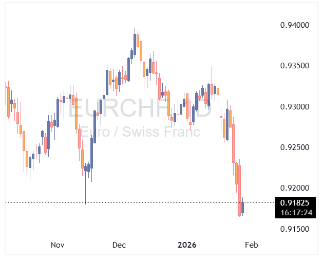 در یک نگاه بانک مرکزی سوئیس خط قرمزی در نرخ EURCHF حدود ۰.۹۲۰۰ برای مداخله در بازار تعیین کرده بود. کاهش اخیر نرخ EURCHF به زیر این سطح نشاندهنده احتمال