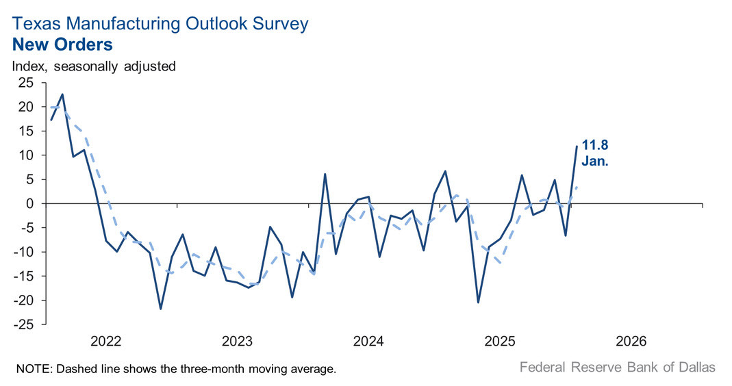 شاخص تولیدات صنعتی فدرال رزرو دالاس در ماه ژانویه نشانهای روشن از بهبود را مخابره کرد. این شاخص از سطح منفی ۱۱.۳ در ماه قبل به منفی ۱.۲ رسید؛ حرکتی