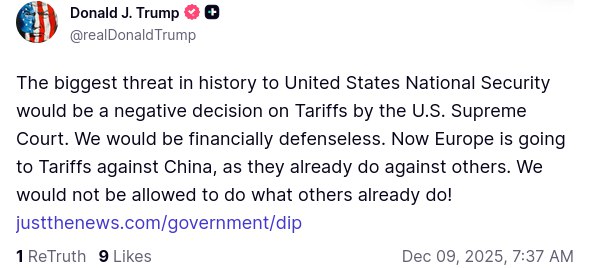ترامپ اعلام کرد که بزرگترین تهدید در تاریخ امنیت ملی ایالات متحده، یک تصمیم منفی دیوان عالی کشور درباره تعرفهها خواهد بود، زیرا این امر آمریکا را از نظر مالی