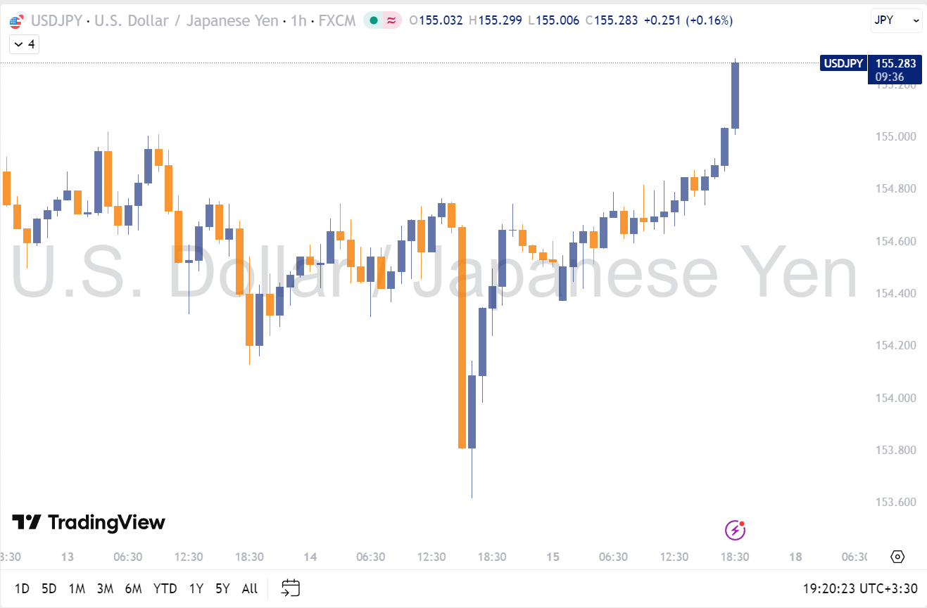 جفتارز USDJPY دقایقی پیش با عبور از سطح حساس 155.00؛ برای نخستینبار از فوریه، با موجی از استاپهای خرید مواجه شد و حرکت صعودی آن تا 155.25 ادامه یافت؛ سطحی