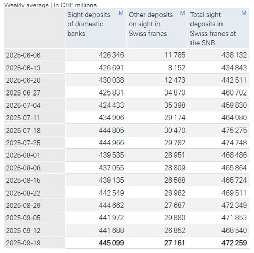 بانک ملی سوئیس اعلام کرد که مجموع سپرده‌های دیداری در هفته منتهی به ۱۹ سپتامبر به ۴۷۲.۳ میلیارد فرانک سوئیس رسیده است، که نسبت به رقم قبلی ۴۶۸.۵ میلیارد فرانک