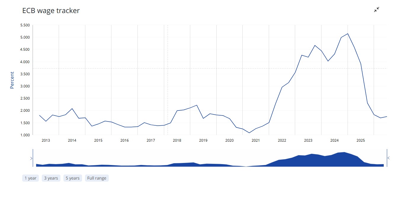 بر اساس دادههای جدید بانک مرکزی اروپا، شاخص ردیاب دستمزد این نهاد در سهماهه دوم سال ۲۰۲۶ به ۱.۷۶٪ رسیده است که نسبت به رقم ۱.۷۰۳٪ در سهماهه اول سال